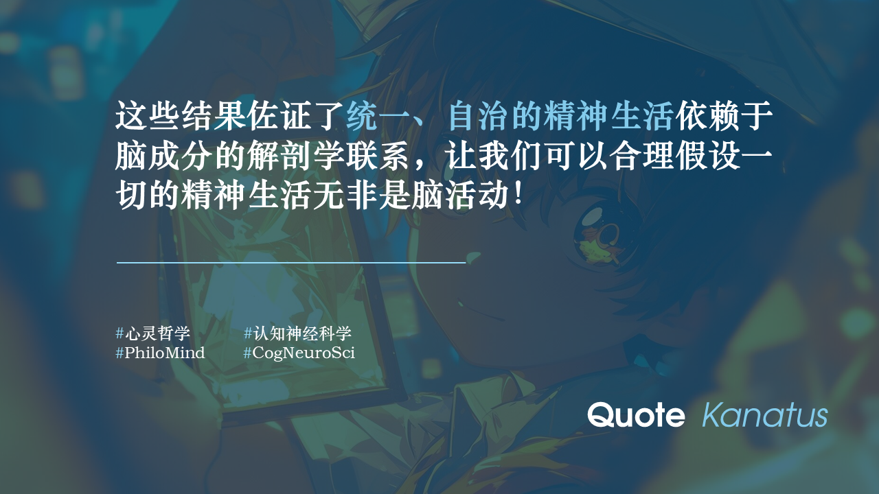 这些结果佐证了统一、自治的精神生活依赖于脑成分的解剖学联系,让我们可以合理假设一切的精神生活无非是脑活动!否则,如果精神生活依赖于非生理活动且没有任何生理性质,那为何分裂脑导致了分裂精神?目前没有人可以找到一个精神的非生理理论能跟一切实验证据相合。