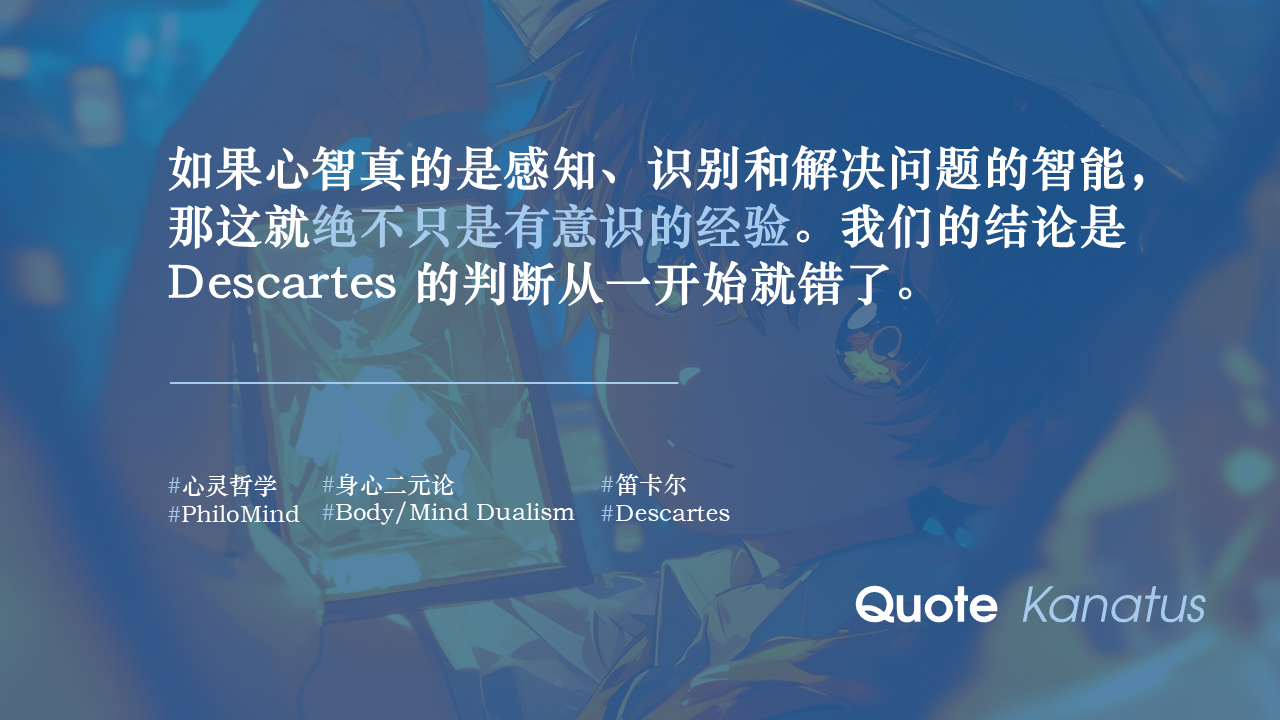 之前提过 Descartes 的「我思故我在」,也就是说 Descartes 其实认为心智就是有意识的心智。所以如果存在无意识的心智,那么 Descartes 的判断就是成问题的。其实直观上我们都知道视觉模式认知很可能是无意识的:我们从没想过要去看什么,我们却就是看到了。其实我们有很多证据说明无意识心智的存在,而且涉及的是正常主体而非临床主体。第一个例子是我们说话并没有意识到接下来要说什么字什么词什么表达。在无意识中是脑的决策掌管了用词选择甚至是内容自身。第二个例子是人们在无意识中会用瞳孔大小来判断他人的可亲近程度。但我们却从来没意识到我们在看瞳孔,甚至是在做这个判断。