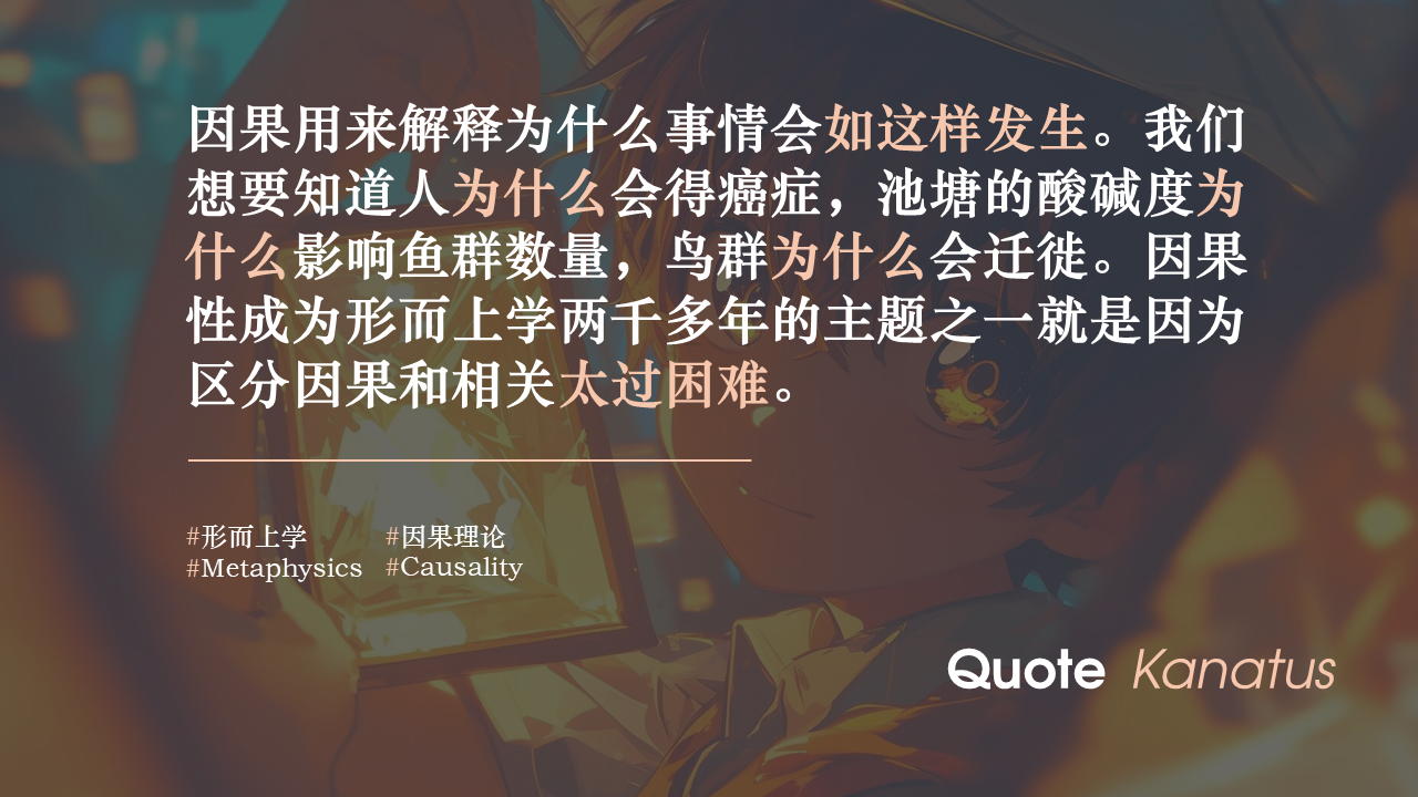 因果用来解释为什么事情会如这样发生。我们想要知道人为什么会得癌症,池塘的酸碱度会不会影响鱼群数量,鸟群为什么会迁徙。因果性称为形而上学两千多年的主题之一就是因为区分因果和相关太过困难。原因是宇宙的一部分,但这并不是说它像兔子一样是实体。一只兔子可能是某件事的原因,比如某个脚印,但把宇宙的每一个实体列出来的名单不会有任何一个东西叫原因。但这并不是说原因是虚构的,它跟其他事情一样真实,当牙医要对你做根管治疗时,你希望他成为这个东西的原因:打麻醉。