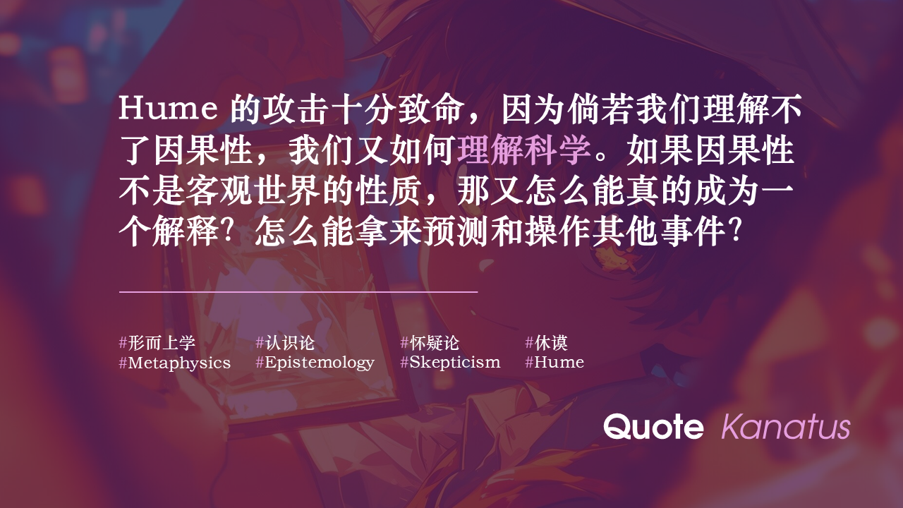 Hume 的攻击十分致命,因为倘若我们理解不了因果性,我们又如何理解科学。如果因果性不是客观世界的性质,那又怎么能真的成为一个解释?怎么能拿来预测和操作其他事件?