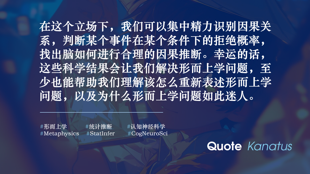 形而上学到此为止。实用主义建议我们采纳如下立场,假设存在一般的因果规律,并且假设当我们发现这样的因果规律之后能够对自然进程做出更好的预测。在这个立场下,我们可以集中精力识别因果关系,判断某个事件在某个条件下的拒绝概率,找出脑如何进行合理的因果推断。幸运的话,这些科学结果会让我们解决形而上学问题,至少也能帮助我们理解该怎么重新表述形而上学问题,以及为什么形而上学问题如此迷人。